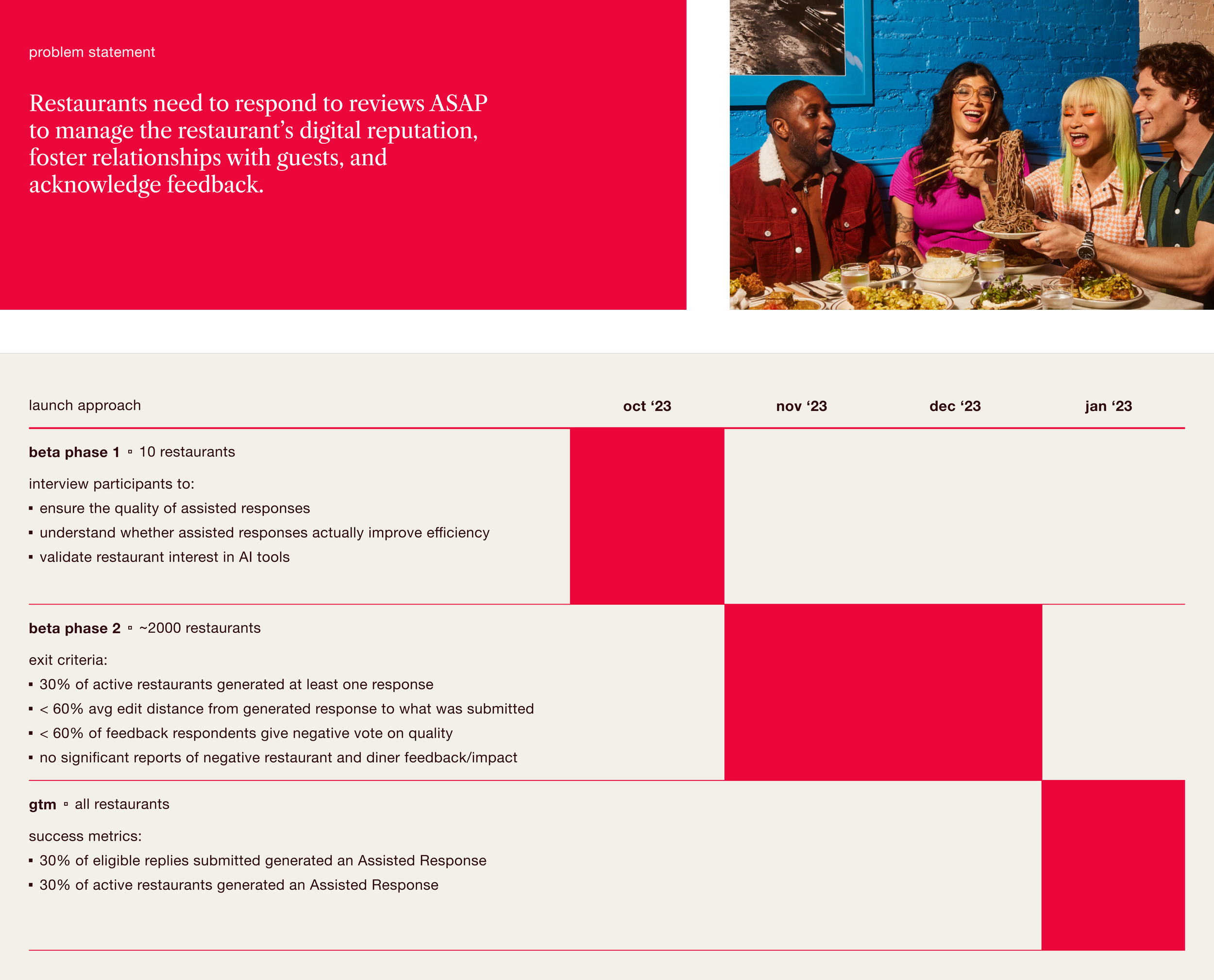 Designed OpenTable’s first Gen AI tool that generates personalized responses to diner reviews, saving restaurants time while still providing a personal touch.